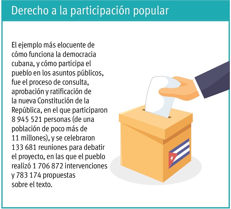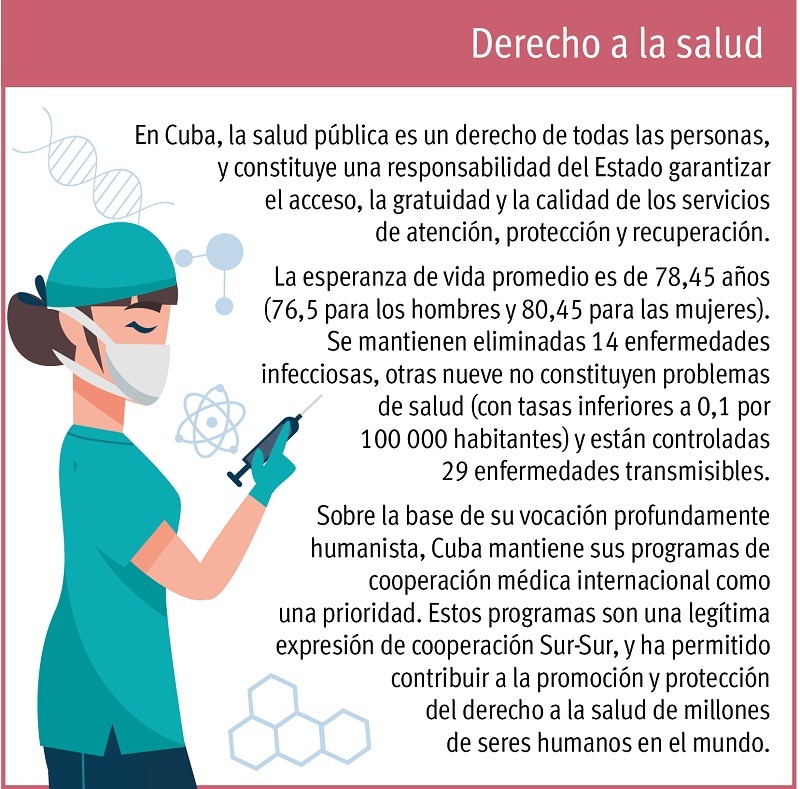 Gracias a la voluntad política del Gobierno y la activa participación popular en todos los ámbitos de la vida del país, y a pesar del grave efecto del bloqueo económico, comercial y financiero impuesto durante seis décadas por Estados Unidos, en violación de la Carta de las Naciones Unidas y el Derecho Internacional, Cuba ha podido obtener importantes éxitos en la promoción y protección de los derechos humanos.