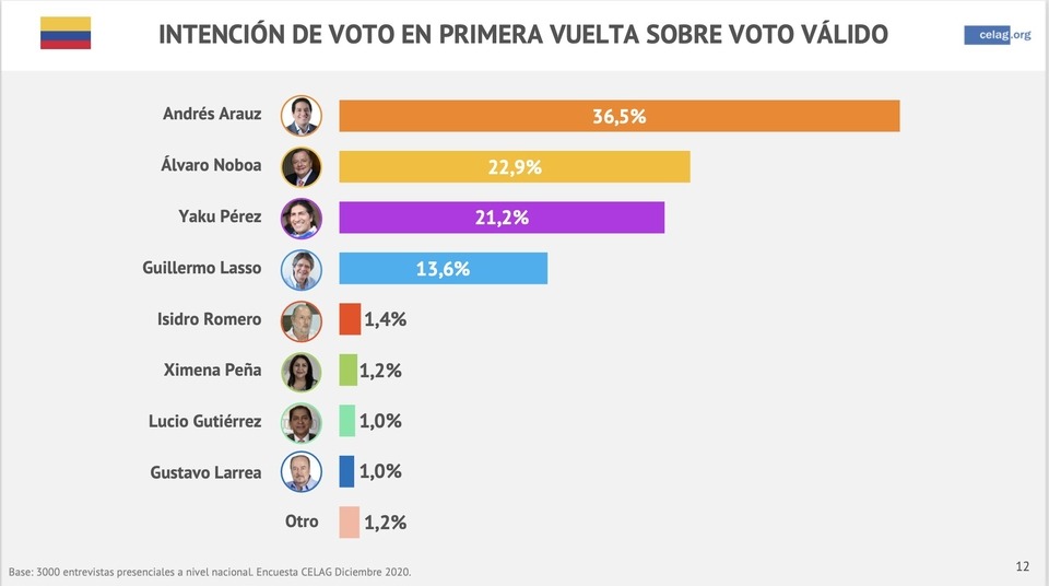 A menos de dos meses para los comicios presidenciales en Ecuador, una encuesta publicada por el Centro Estratégico Latinoamericano de Geopolítica (Celag) le otorga un triunfo por amplia diferencia al candidato del correísmo, Andrés Arauz. El joven economista encabeza las preferencias electorales con el 36,5 por ciento de intención de voto, seguido por el empresario Álvaro Noboa con el 22,9 por ciento y Yaku Pérez, candidato del partido indigenista Packakutik con 21,2 por ciento, mientras que el banquero oriundo de Guayaquil, Guillermo Lasso, ronda el 13,6 por ciento.