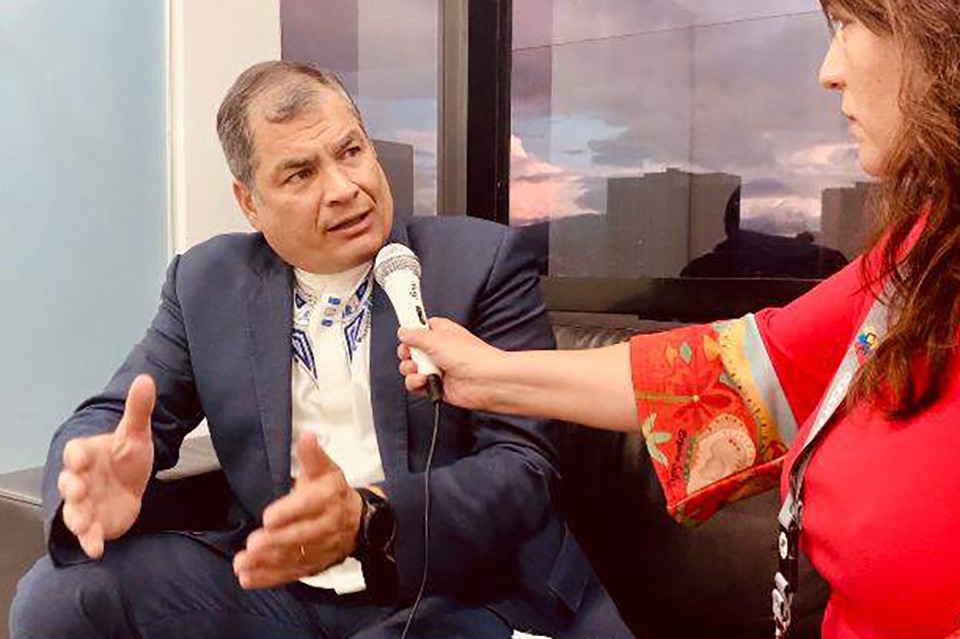 Correa viste traje azulino y camisa blanca andina con bordado precolombino azul. El acostumbrado atuendo continúa siendo un mensaje identitario nacional al que no ha renunciado. La sala donde transcurre la entrevista está vidriada. Desde los ventanales se ve parte de la ciudad. Afuera del salón circula a la espera de una reunión Fernando Lugo, el expresidente paraguayo derrocado por un golpe de Estado blando en 2012 quien también es parte de los ex mandatarios veedores junto al boliviano Evo Morales y al español José Luis Rodríguez Zapatero.