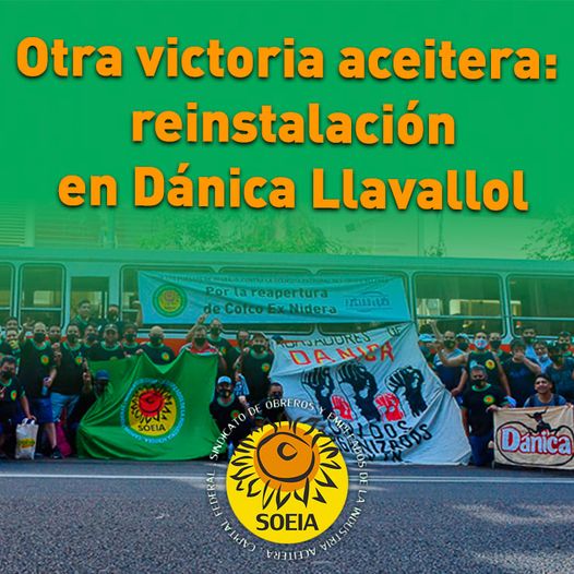 Como suelen hacer, los aceiteros resaltaron a quienes protagonizaron el logro, las y los trabajadores, en este caso de Dánica Llavallol, quienes «han sostenido contra la prepotencia patronal del Grupo Beltrán, a pesar de todos los intentos de atemorizarlos y dividirlos, nunca dejaron de pelear por todos sus derechos, por su Convenio aceitero, por su salario y por sobre todas las cosas nunca dejaron de pelear por la reincorporación.», reconocieron.
