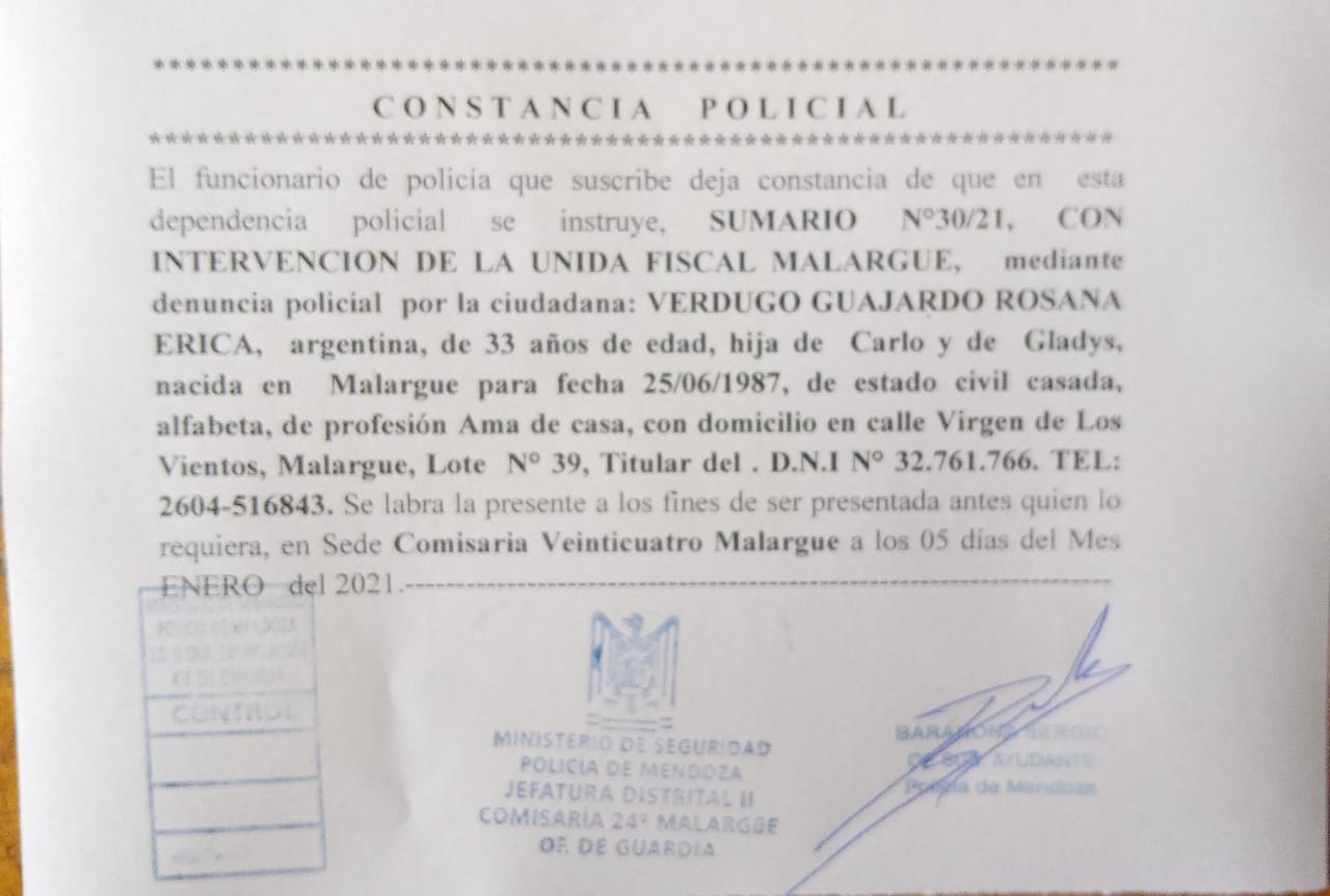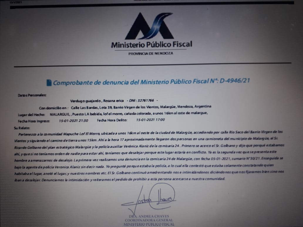 La comunidad realizó una denuncia policial al día siguiente, y esta segunda vez también ha sido denunciado por amenazas (anexamos copia de denuncia). Esperamos que la Fiscalía de Malargüe actúe rápidamente como en oportunidades de otros delitos y Violencia Institucional.