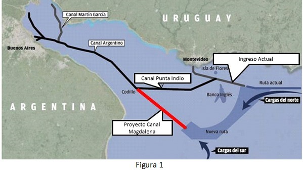 En este punto solo hace falta mirar un mapa para sorprenderse. Ya que el canal Punta Indio cruza transversalmente el rio hasta Montevideo. Su dragado es costoso por el hecho de que es como una cuneta que recoge los sedimentos que descargan hacia el mar. Es transversal a la corriente y a los peores vientos y mareas, lo que entorpece la navegación. Es un canal de una sola mano lo que produce “embotellamiento” de buques. Y, lo peor de la situación, es que no existe otro canal de salida hacia aguas marítimas que no sea este canal hacia Montevideo, nuestra salida al mar abierto pasa por aguas jurisdiccionales de otro país congestionadas. Y si bien la unidad latinoamericana es un horizonte deseable, y la unidad económica aduanera y jurídica con Uruguay sería deseable siguiendo los ideales de Artigas y otros patriotas, con la posibilidad de establecer un sistema común que permitiera el control completo del Plata. Hasta un puerto binacional como pensaba Perón en condiciones de profunda unidad. Pero lo cierto es que Artigas perdió en Uruguay, nuestro país anda a los tumbos, y somos países distintos.