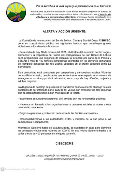 Según la CISBCSC, el Alcal­de de Río Negro (San­tan­der) y la Ins­pec­to­ra de Polí­cia del Corre­gi­mien­to de San Rafael de Lebri­ja tie­nen pro­gra­ma­da una acción de des­alo­jo para más de 100 fami­lias cam­pe­si­nas (alre­de­dor de 400 per­so­nas) asen­ta­das en pla­yo­nes comu­na­les del com­ple­jo cena­go­so del Río Lebri­ja, exac­ta­men­te en el pre­dio La Berraquera.