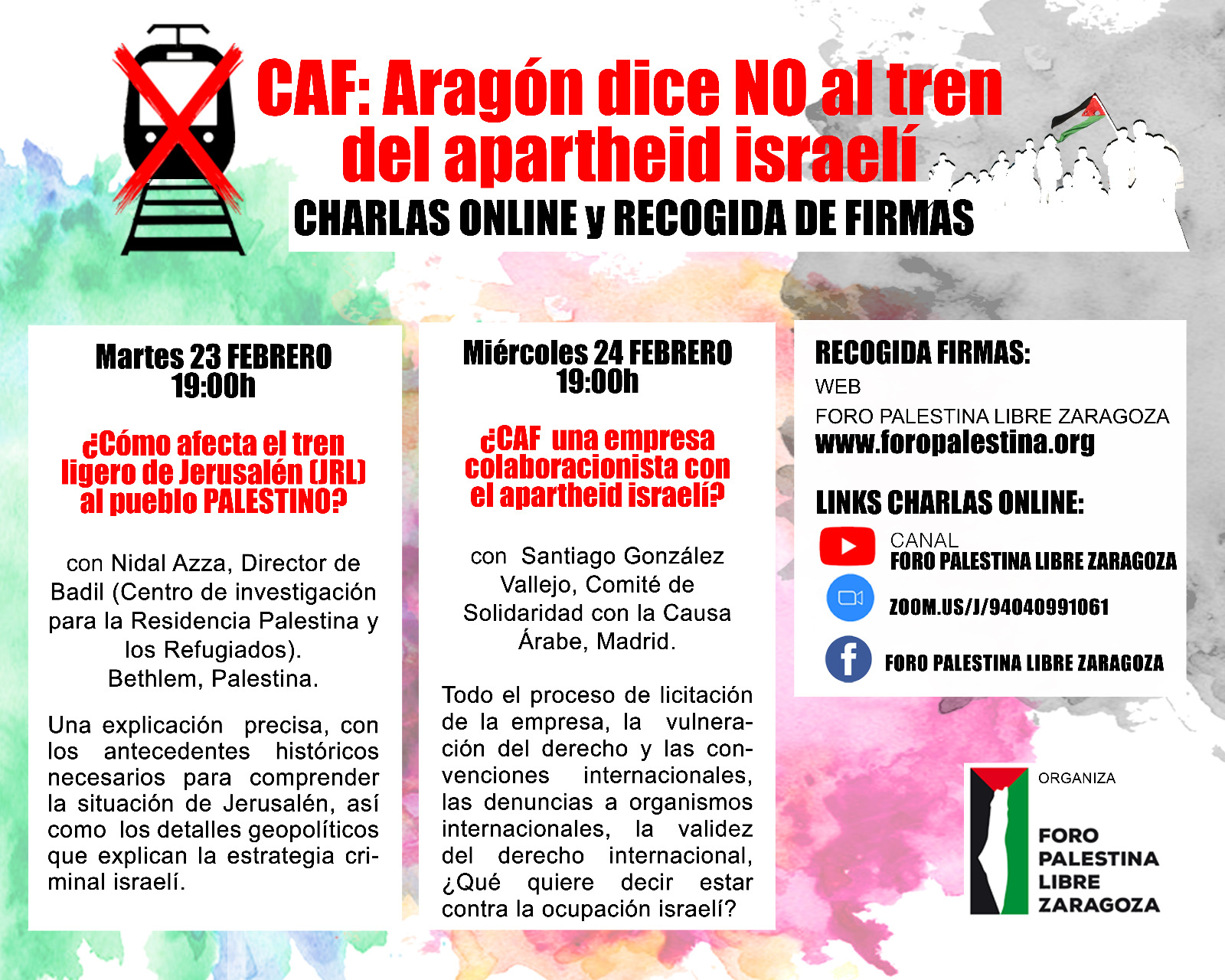 El Foro Palestina Libre de Zaragoza considera que la incidencia criminal de este tren construido en su mayor parte en Zaragoza, la forma en la que afectará a la vida y a la tierra palestinas , ha de ser conocida y contestada con rotundidad por el mayor número posible de las gentes que habitamos este territorio y que tradicionalmente han expresado su solidaridad con el pueblo palestino.