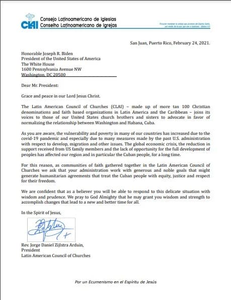 El CLAI le pide al Gobierno del mandatario demócrata que «trabaje con metas generosas y nobles que generen acuerdos humanitarios y traten al pueblo cubano con equidad, justicia y respeto por su libertad», agrega.