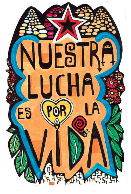 Las mujeres no solo luchamos contra la muerte, luchamos contra los vidatenientes. Agentes patriarcales que creen tener el derecho a usar nuestras vidas para su beneficio y explotación. Nuestras vidas, un recurso desechable más, una mercancía del capitalismo. La perversa asociación de agua con dinero es lo que ha roto los ciclos naturales en los ecosistemas; y luego, cuando el despojo está más empoderado que nunca y la Tierra tan desequilibrada, el mercado nos vende un paraíso falso de chichis de silicón. Estamos en la búsqueda de otras maneras de habitar este planeta y ser entre nosotres. Importante resaltar el papel de faro del movimiento zapatista; autonomía que desde la antigua Mesoamérica, ilumina un camino posible hacia lo pospatriarcal. También el movimiento indígena en Bolivia que ha generado su propia teoría crítica y nos da luz sobre la necesidad de autogobiernos comunitarios y para estatales. Y la hermandad del proyecto indígena americano con la lucha de la revolución de las mujeres kurdas, en la antigua Mesopotamia.
