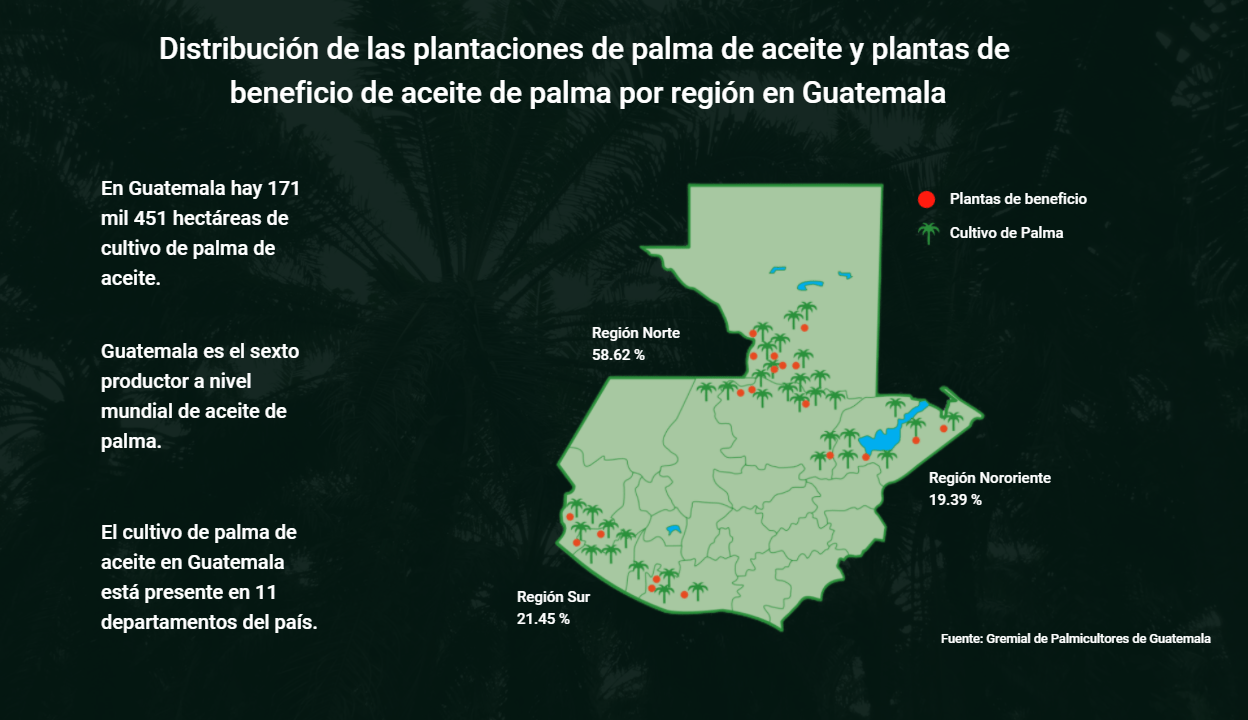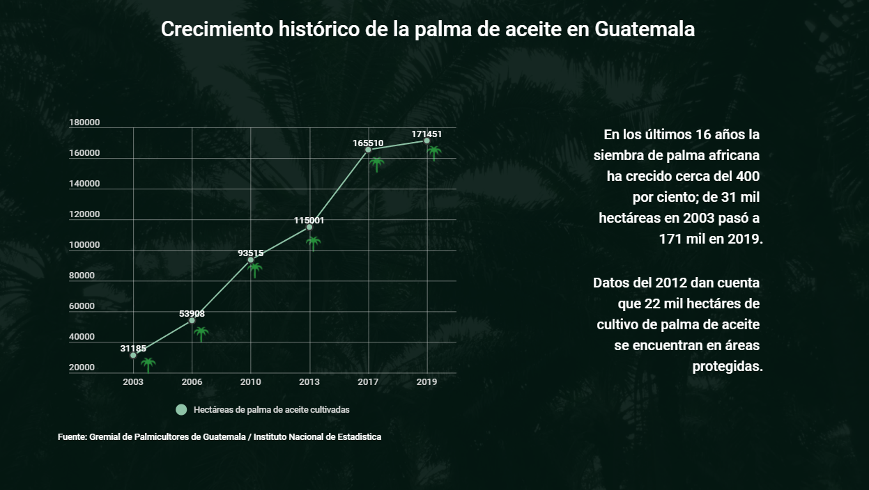 En Guatemala, los conflictos sociales por el cultivo de palma se han vuelto habituales. En los últimos 17 años la siembra de palma de aceite creció casi 400 por ciento; de 31 mil hectáreas en 2003 pasó a 171 mil 581 en 2019. Esto ha convertido a Guatemala en el sexto productor de palma a nivel mundial y el tercer exportador. Según datos de la Gremial de Palmicultores de Guatemala (Grepalma) hay 235 productores de palma a nivel nacional.