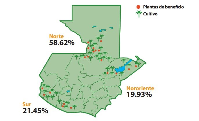 “El cultivo de palma de aceite se localiza en la región norte, nororiente y sur de Guatemala. En estos lugares, la agroindustria guatemalteca de aceite de palma genera 30 mil empleos directos y 143 mil empleos indirectos, generando oportunidades de crecimiento para los pobladores y sus comunidades vecinas en áreas donde había escasas o nulas inversiones previo al establecimiento de proyectos palmeros. En el año 2020, pese a la crisis por covid-19, el sector de palma logró mantener e incrementar en un cinco por ciento los empleos directos generados, contribuyendo de esta manera con la reactivación económica y las oportunidades para el país”, destacó Enríquez.