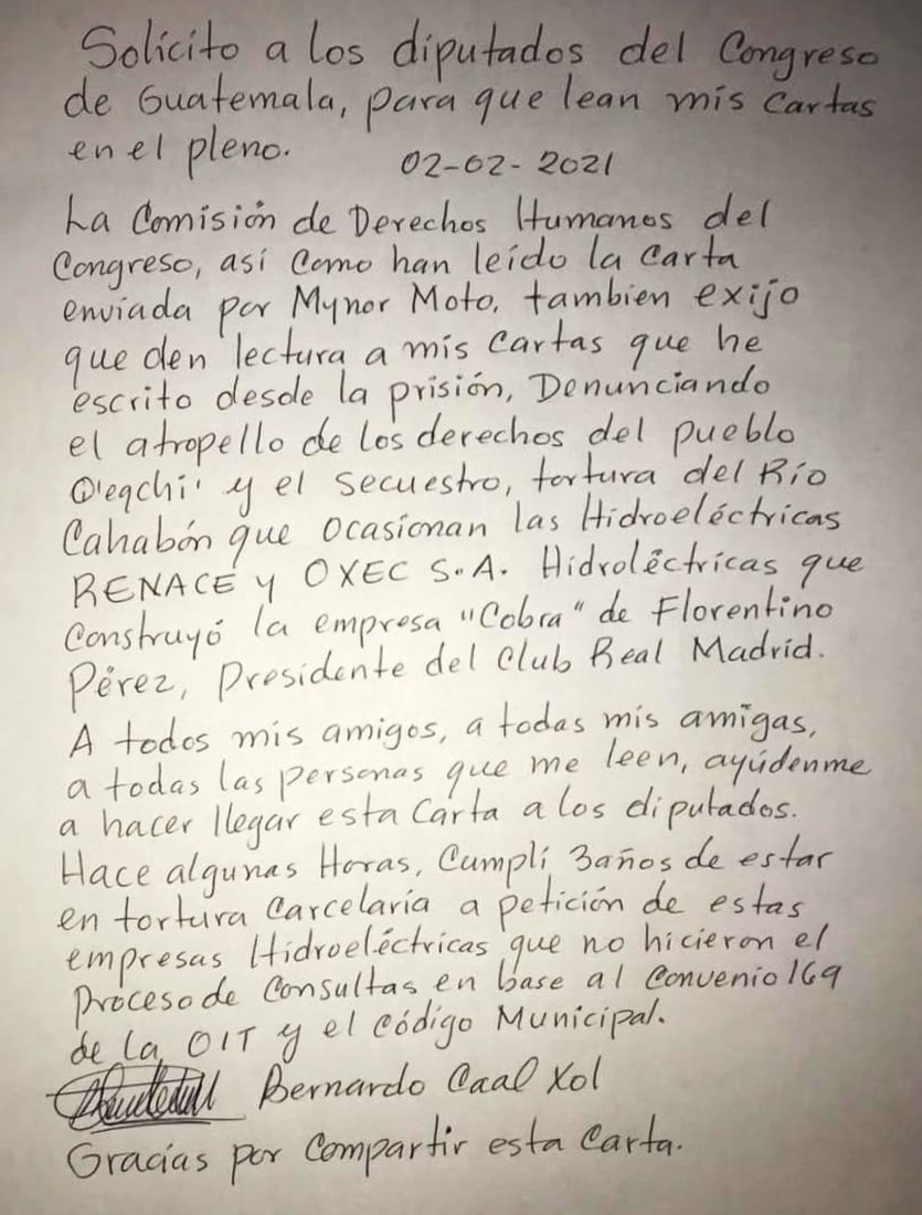 La Comisión de Derechos Humanos del Congreso, así como han leído la carta enviada por Mynor Moto, también exijo que den lectura a mis cartas que he escrito desde prisión. Denunciando el atropello de los derechos del pueblo Q´eqchi´ y el secuestro, tortura del Río Cahabón que ocasionan las Hidroeléctricas RENACE y OXEC SA. Hidroeléctricas que construyó la empresa “Cobra” de Florentino Pérez, Presidente del club Real Madrid.