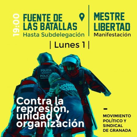 4º La asamblea local de Nación Andaluza en Granada manifestamos nuestra solidaridad hacia la familia, y amigas de los dos jóvenes presos y pedimos su inmediata puesta en libertad. Mientras esto ocurre llamamos a nuestra militancia, adheridas y simpatizantes a acudir y apoyar todas las movilizaciones por la liberación de los jóvenes como la que tendrá lugar este lunes día 1 de marzo a partir de las 19 horas en la Fuente de las Batallas por la libertad de “Mestre”, uno de los encarcelados militante del sindicato CNT.
