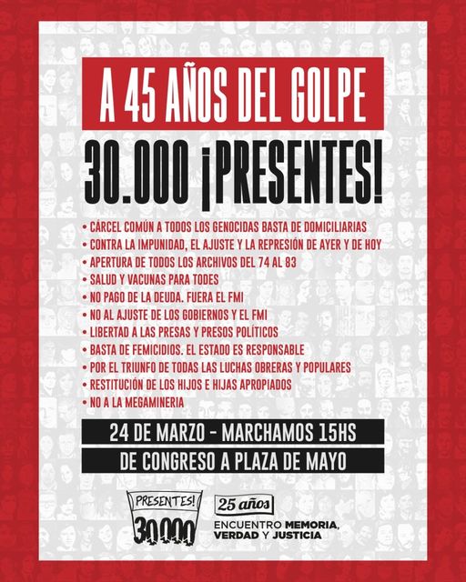 Desde la Plaza del Congreso, los nucleamientos enrolados en el Encuentro Memoria Verdad y Justicia, marcharán a partir de las 15 horas hasta Plaza de Mayo, reivindicando las luchas de ayer y también las de hoy contra el autoritarismo, la represión y las políticas económicas hambreadoras. A los militantes de las organizaciones de izquierda se le sumarán autoconvocadxs, que como todos los años concurren a recordarle a los nostálgicos de aquella dictadura sangrienta que son muchos y muchas quienes están dispuestos a que la barbarie uniformada y sus cómplices civiles no retornen jamás. Pero también serán reivindicados Julio López, Facundo Castro, Rafael Nahuel y tantos otros y otras que fueron desaparecidxs y asesinadxs en democracia.