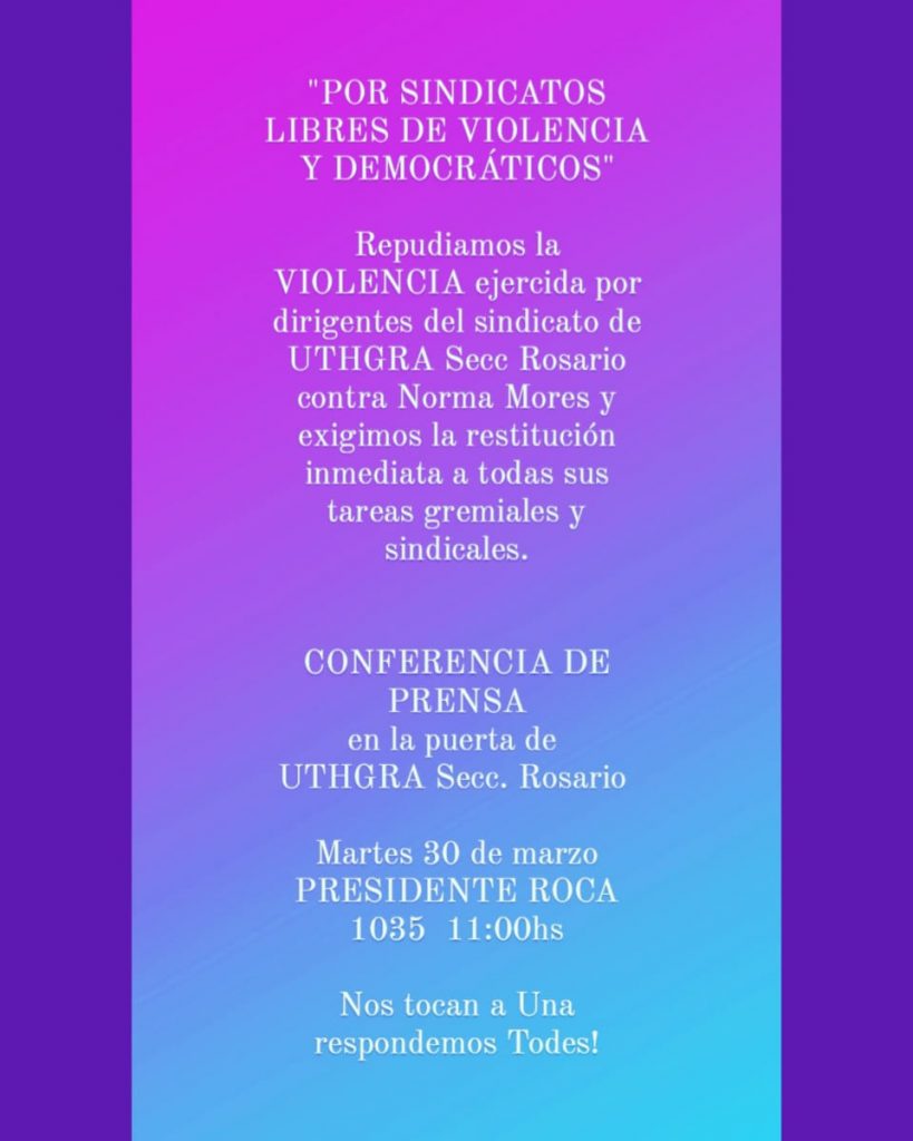 Con este fin, junto al Comité de Emergencia de Rosario, la Intersindical de Mujeres de Rosario y diversas agrupaciones políticas y sindicales, convocaron el próximo martes a una conferencia de prensa en la puerta de la sede del sindicato en Rosario.