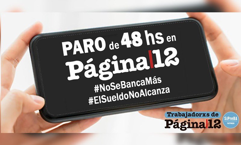 Con las consignas #NoSeBancaMás y #ElSueldoNoAlcanza, la medida comenzó ayer y se extiende durante todo el día de hoy, ante la negativa de Víctor Santa María (titular del Grupo Octubre – dueño de Página/12‑, Secretario General del Sindicato Único de Trabajadores de Edificios de Renta y Horizontal-SUTERH y dirigente del PJ porteño) de recibir a las delegadas y delegados de la comisión interna de quienes trabajan en la redacción del medio para discutir las condiciones de trabajo, la recomposición salarial y el reconocimiento laboral de la totalidad del plantel que garantiza la existencia del diario. Por ANRed.