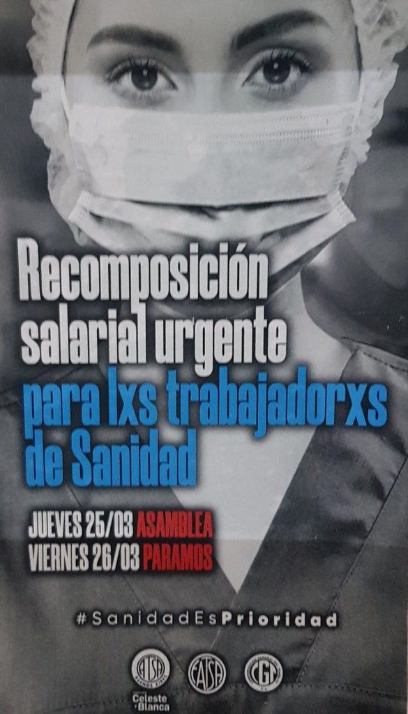 «Hoy, en plena pandemia, (los trabajadores y las trabajadoras de) la Sanidad de todo el país está de paro en reclamo por una recomposición salarial justa y digna. Estamos con un alto acatamiento a una medida de acción sindical ejemplar, lxs trabajadorxs de sanidad y exigimos que se reconozca nuestro esfuerzo», informó a través de su cuenta de Twitter, Héctor Daer, secretario adjunto de Fatsa y cotitular de la Confederación General del Trabajo (CGT).