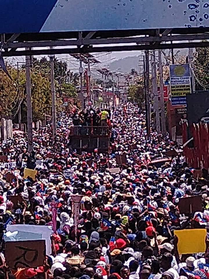 Es difí­cil eva­luar el núme­ro de per­so­nas, muje­res y hom­bres, que salie­ron a las calles al ser tan com­pac­ta la mul­ti­tud de mani­fes­tan­tes, en varias ciu­da­des de pro­vin­cia (Cap-Hai­tien /​Nord, Les Cayes /​Sud, Jac­mel /​Sud-Est, Grand-Goâ­ve y Léo­ga­ne /​Ouest, Mire­ba­lais /​Pla­teau cen­tral …).Tam­bién en el área metro­po­li­ta­na de la capi­tal, Port-au-Prin­ce, cien­tos de miles se movi­li­za­ron para expre­sar su des­con­ten­to con el régi­men de fac­to, que qui­sie­ra impo­ner una dic­ta­du­ra, sofo­car los recla­mos que se hacen al gobierno nacio­nal e ins­tau­rar un rei­no de secues­tros en el terri­to­rio nacio­nal, obser­vó la agen­cia en línea AlterPresse.