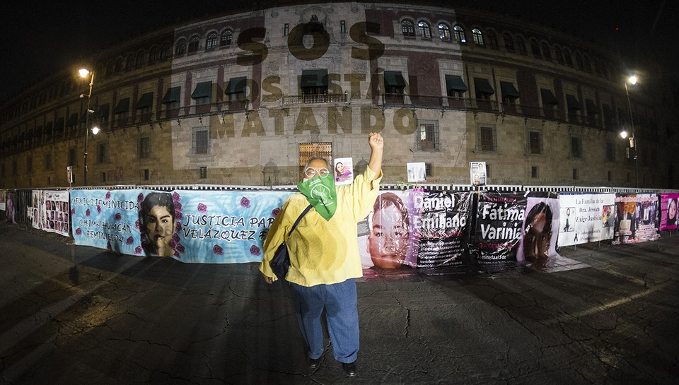 “SOS nos están matan­do”, fue una de las pro­yec­cio­nes en la facha­da del pala­cio don­de per­noc­ta el pre­si­den­te. “La vio­len­cia con­tra las muje­res ha esca­la­do a nive­les exor­bi­tan­tes: duran­te 2020 fue­ron ase­si­na­das 3 mil 752 muje­res en el país”, denun­cia­ron las madres.