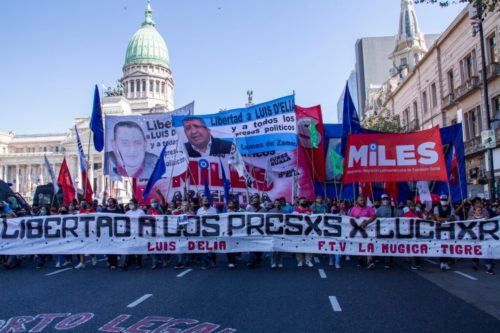 Miles de manifestantes (15 mil según los convocantes) de organizaciones sociales y políticas ligadas al kirchnerismo marcharon este lunes desde Plaza Once hasta el Palacio de los Tribunales, exigiendo la libertad de los presos políticos, entre los que se encuentran Luis D’Elía y Milagro Sala. Pudo verse grandes columnas del partido Miles, fundado por D’ Elía, del Movimiento Evita, de la Liga por los Derechos Humanos,del Frente Milagro Sala, de la Túpac Amaru, del MTL y la CTA, entre otras muchas.