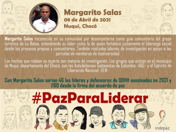 Según Indepaz, con la muerte de Margarito Salas se cuentan 46 los líderes sociales y defensores de los derechos humanos asesinados durante 2021 en Colombia, y 1.160 desde la firma del Acuerdo de Paz en 2016.