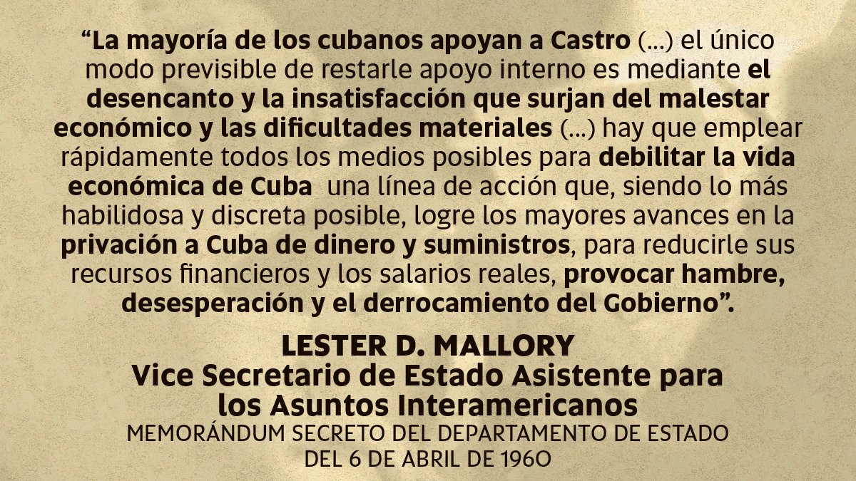 Según el docu­men­to, ‘… todos los medios posi­bles deben uti­li­zar­se rápi­da­men­te para debi­li­tar la vida eco­nó­mi­ca de Cuba … un cur­so de acción que (…) logra el mayor avan­ce en pri­var a Cuba de dine­ro y sumi­nis­tros, con el fin de redu­cir sus recur­sos eco­nó­mi­cos y sala­rios reales, pro­vo­can ham­bre, deses­pe­ra­ción y el derro­ca­mien­to del gobierno. ‘