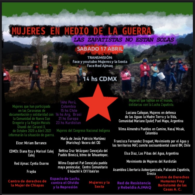 Mujeres que han participado en las Caravanas de documentación y solidaridad con la Comunidad de Nuevo San Gregorio y la Región Moisés Gandhi del Caracol X, de Octubre 2020 a Abril 2021, informarán la situación de guerra