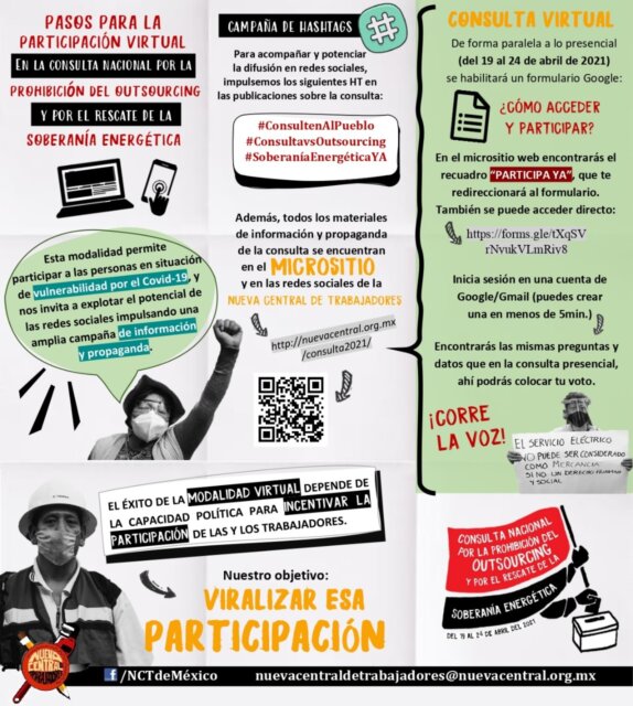 Además de posicionarse contra el outsourcing, con la consulta buscan plantear una postura contra la reforma energética, pues, la Nueva Central considera que en el actual gobierno “se ha continuado con una lógica neoliberal en términos de privatización de la energía” y quieren mostrar que ante estas reformas hubo un sector que no estuvo de acuerdo.
