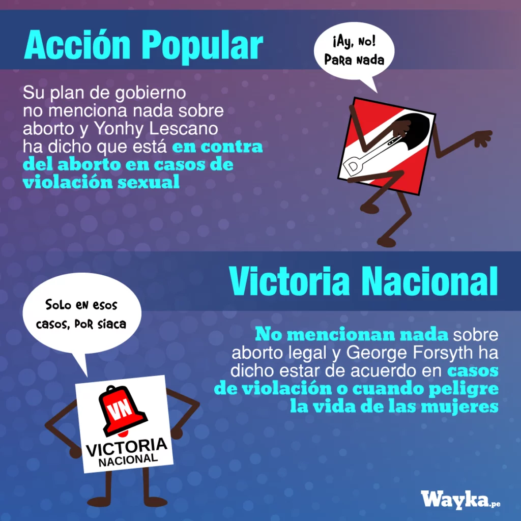 En la misma línea está la postura de Yonhy Lescano, candidato de Acción Popular, quien ha confirmado su postura en contra del aborto por violación y su plan de gobierno tampoco menciona nada al respecto. Por su parte, George Forsyth, de Victoria Nacional, ha dicho que solo están de acuerdo con el aborto por violación y el terapéutico, aunque su plan de gobierno no dice nada sobre esa alternativa.