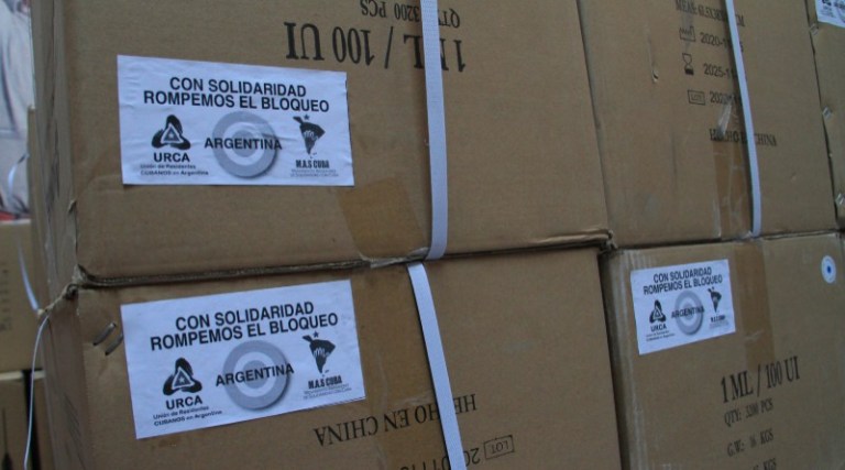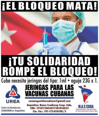 En el mar­co de la cam­pa­ña “Tu soli­da­ri­dad Rom­pe el Blo­queo” orga­ni­za­da por el Movi­mien­to Argen­tino de Soli­da­ri­dad con Cuba (MAS Cuba) y la Unión de Resi­den­tes Cuba­nos en la Argen­ti­na (URCA) des­ti­na­da a reu­nir agu­jas y jerin­gas que con­tri­bu­yan a la vacu­na­ción del pue­blo cubano, se des­pa­cha­ron de 380.000 jerin­gas y 359.000 agu­jas en el aero­puer­to de Ezei­za, para ser car­ga­dos en el vue­lo de Cuba­na de Avia­ción CU361. https://​www​.you​tu​be​.com/​e​m​b​e​d​/​r​9​O​v​Q​z​o​e​t​x​Q​?​e​n​a​b​l​e​j​s​a​p​i​=​1​&​a​u​t​o​p​l​a​y​=​0​&​c​c​_​l​o​a​d​_​p​o​l​i​c​y​=​0​&​c​c​_​l​a​n​g​_​p​r​e​f​=​&​i​v​_​l​o​a​d​_​p​o​l​i​c​y​=​1​&​l​o​o​p​=​0​&​m​o​d​e​s​t​b​r​a​n​d​i​n​g​=​0​&​r​e​l​=​1​&​f​s​=​1​&​p​l​a​y​s​i​n​l​i​n​e​=​0​&​a​u​t​o​h​i​d​e​=​2​&​t​h​e​m​e​=​d​a​r​k​&​c​o​l​o​r​=​r​e​d​&​c​o​n​t​r​o​l​s​=1&