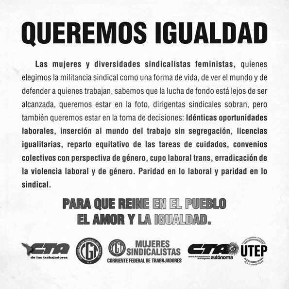 “Queremos igualdad. Quienes elegimos la militancia sindical como una forma de vida, de ver el mundo y de defender a quienes trabajan, sabemos que la lucha de fondo está lejos de ser alcanzada, queremos estar en la foto, dirigentes sindicales sobran, pero también queremos estar en la toma de decisiones. Idénticas oportunidades laborales, inserción al mundo del trabajo sin segregación, licencias igualitarias, reparto equitativo de las tareas de cuidados, convenios colectivos con perspectiva de género, cupo laboral trans, erradicación de la violencia laboral y de género. Paridad en lo laboral y paridad en lo sindical. Para que reine en el pueblo el amor y la igualdad”. El comunicado de mujeres y diversidades sindicalistas feministas sintetiza en un párrafo las luchas que estamos teniendo y seguiremos dando.