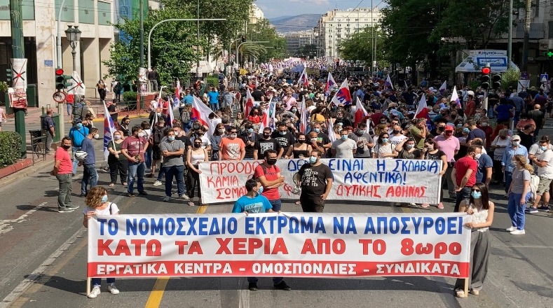 Des­de el pasa­do 10 de junio, los tra­ba­ja­do­res grie­gos sos­tie­nen una huel­ga gene­ral en con­tra de la ley de tra­ba­jo que pro­mue­ve el Gobierno en bús­que­da de una supues­ta «fle­xi­bi­li­za­ción» de las jornadas.