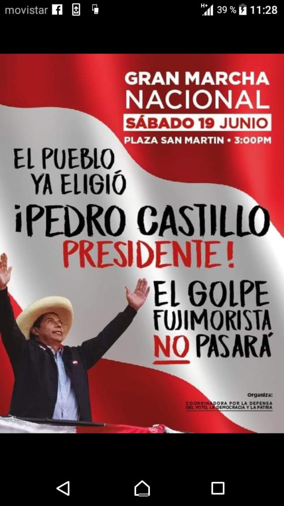 Más de mil ron­de­ros se mani­fes­ta­rán en Lima has­ta que pro­cla­men a Pedro Cas­ti­llo como nue­vo pre­si­den­te de la República.