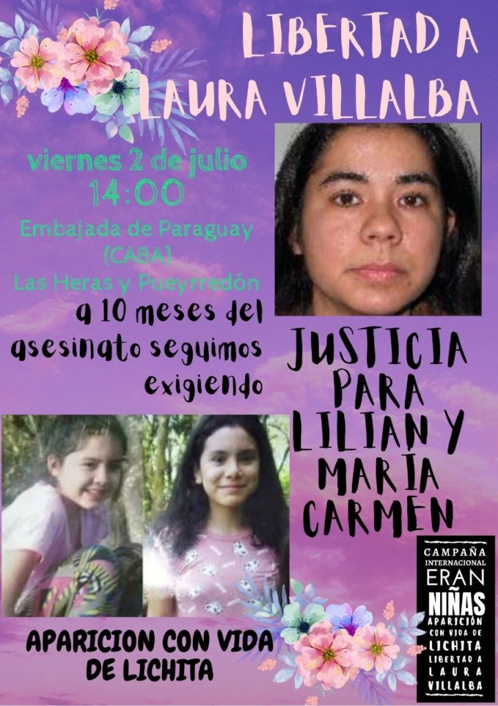 Este viernes de julio la Campaña Eran Niñas convocó a un acto político cultural a la Embajada de Paraguay, en Buenos Aires, para exigir al estado infanticida, Verdad y Justicia para María Carmen y Lilian Mariana, Aparición con vida de Lichita, y Libertad a Laura Villalba.