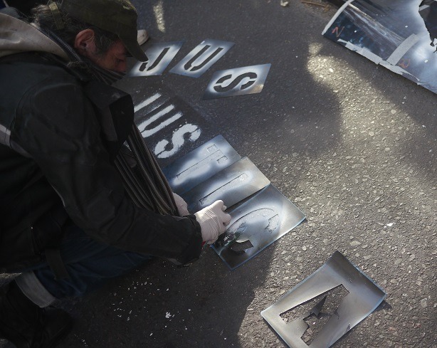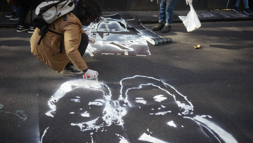 El Frente Cultural Che Adelita realizó un mural en el piso de la calle, frente a las vallas, con el rostro de ambas niñas asesinadas, luego cantó La Vasquita y cerró el canto de Gino Arazzi.