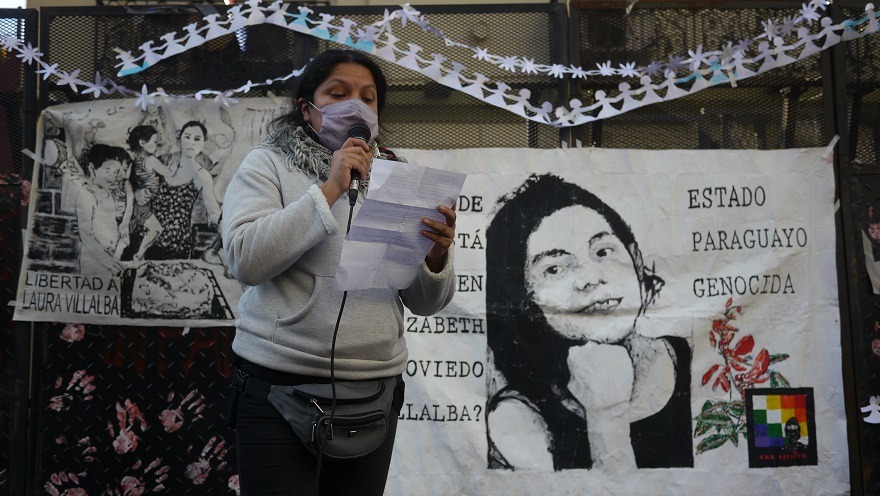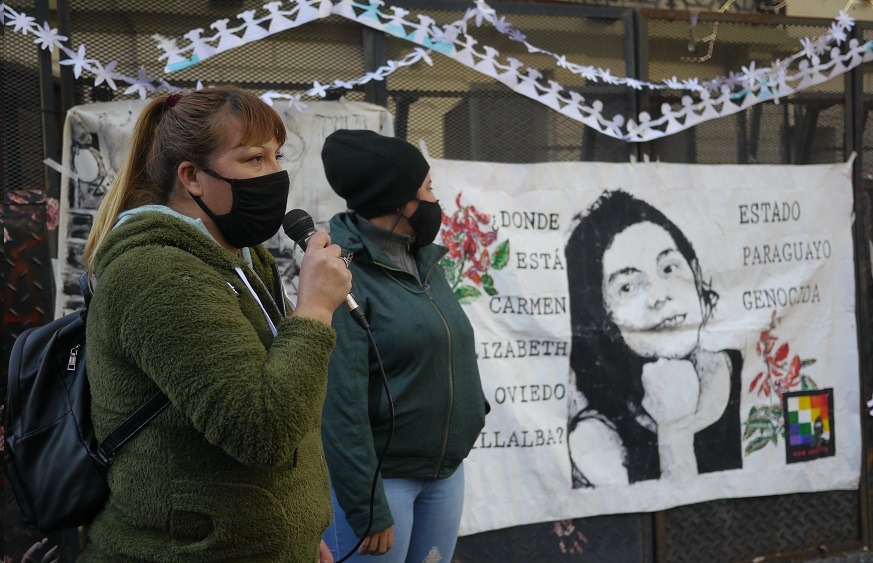 En el marco de gran presencia policial y una embajada totalmente vallado, hablaron varios oradores y oradoras de las organizaciones convocantes y cerraron, Miriam Vasall, madre de un joven fusilado por la policía, Leo Santillán (hermano de Darío, asesinado en la masacre de Puente Puerredón junto a Maxi Kosteki) y Miriam Villalba, madre de una de las niñas asesinadas y hermana de Cármen y Laura. Todos insistieron en la importancia de movilizarse para visivilizar una situación que no debe quedar en la impunidad, y dieron cuenta que 2 de septiembre, cuando se cumpla un año del asesinato por parte del ejército paraguayo de Lilian Mariana y María Cármen , «hay que multplicar por diez nuestra presencia frente a esta embajada».