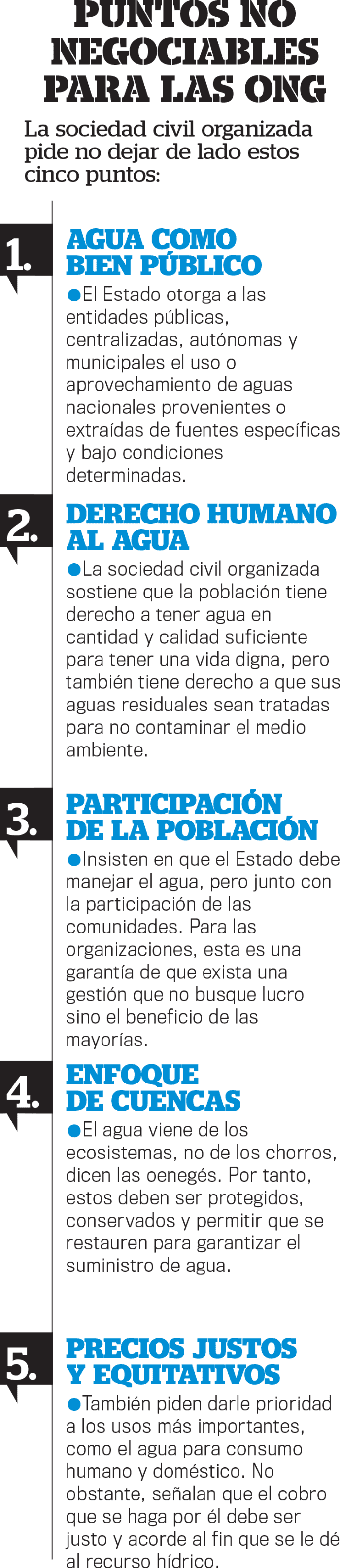 Para la sociedad civil organizada, las coincidencias entre el sector privado y la iniciativa del Ejecutivo confirma sus denuncias. «Queda claro que la propuesta gubernamental de recurso hídrico es una propuesta que está de acuerdo a las expectativas del sector privado», dijo Amalia López, de la Alianza Nacional contra la Privatización del Agua. Este colectivo, que aglutina a 90 organizaciones, es el que ha liderado en los últimos 15 años los esfuerzos por la aprobación de una ley de aguas.
