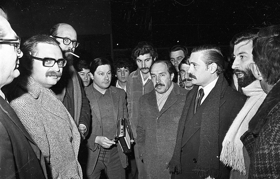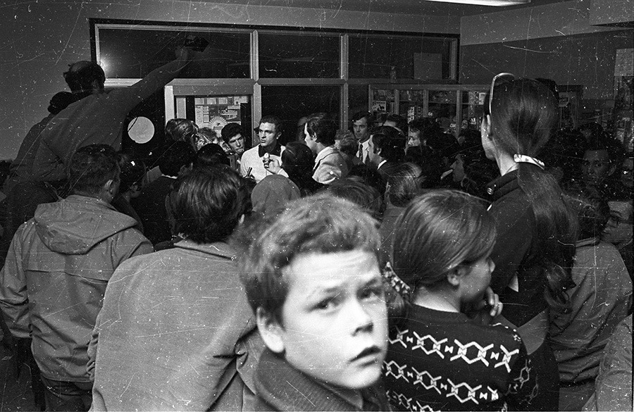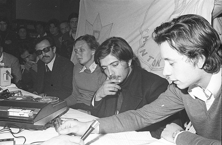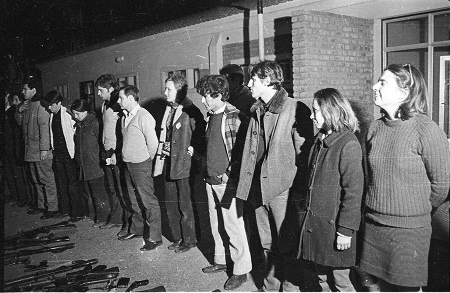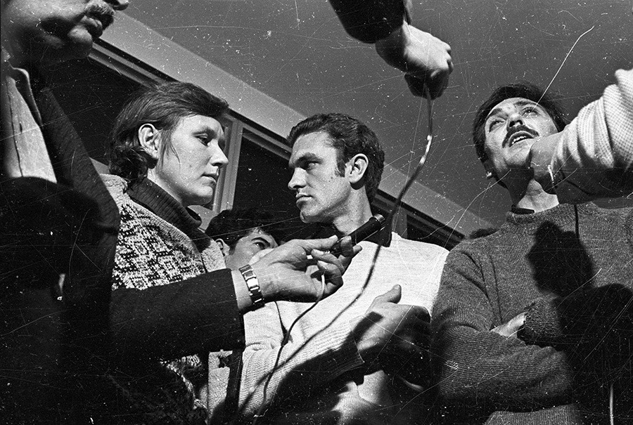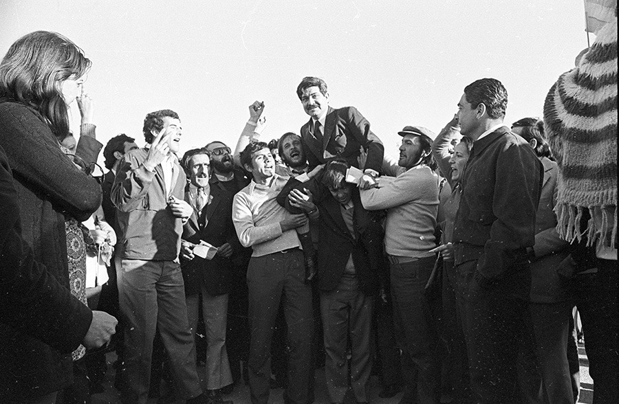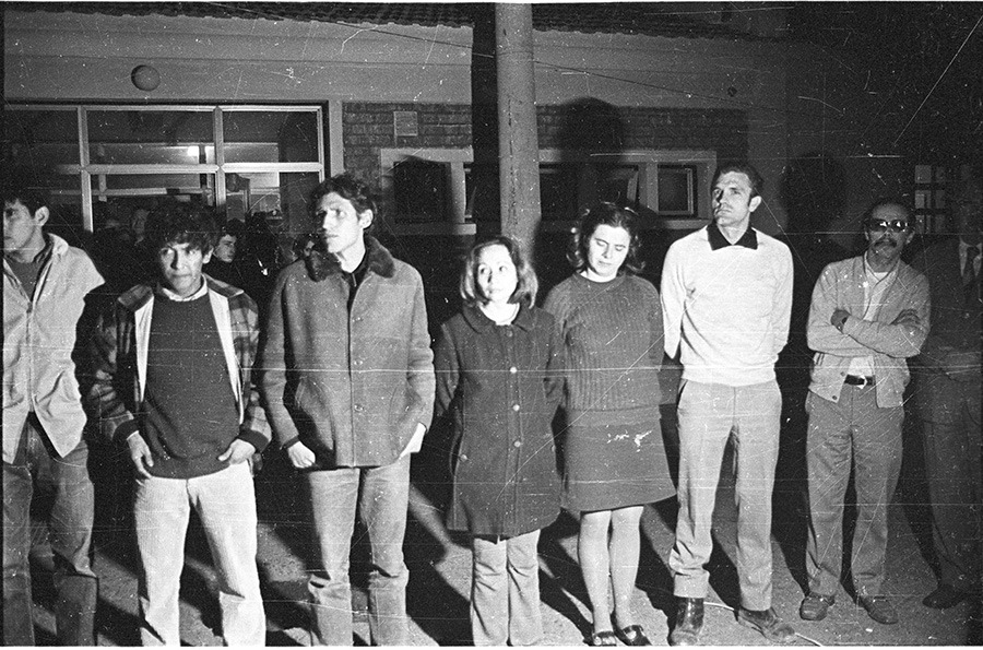 foto: Los 19 integrantes de organizaciones político militar evadidos del penal de Rawson explican la motivación del plan de fuga frente a la prensa y a los numerosos pasajeros que quedaron demorados en el aeropuerto. De izquierda a derecha, detrás de los dos primeros María Antonia Berger con cuello de camisa negro Mariano Pujadas, Rubén Pedro Bonet y el periodista de CANAL 3 Daniel Carreras. 15 de Agosto de 1972. Provincia del Chubut. Aeropuerto de Trelew.