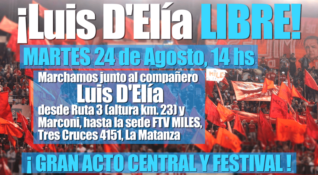Este mar­tes 24 de agos­to, a las 14 horas, agru­pa­cio­nes y orga­ni­za­cio­nes socia­les jun­to al Par­ti­do MILES y la Fede­ra­ción Tie­rra Vivien­da y Hábi­tat (FTV), nos con­cen­tra­re­mos en Ruta 3 (altu­ra Km. 23) y Mar­co­ni para lle­gar has­ta la casa del diri­gen­te Luis D’Elía en Lava­llol 776, Isi­dro Casanova.