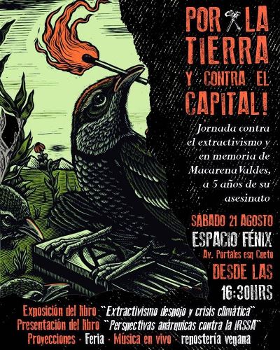 Nos reunimos nuevamente en las afueras del Espacio Fénix ante el llamado de activar contra el extractivismo. Les invitamos a compartir posiciónes y reflexiones ante la devastación que nos rodea, a profundizar en las luchas territoriales que se se han estado librando durante años ante la inminente y azotadora sequía, ante el extractivismo que incesantemente se propaga en las tierras y comunidades mapuches, ante toda la maquinaria e industria que archiva el suelo y las aguas como una mercancía expirable.