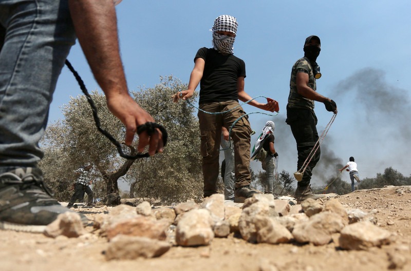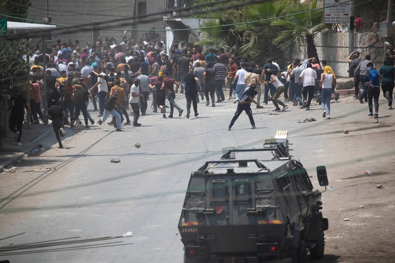 Los mani­fes­tan­tes pales­ti­nos se enfren­tan a las fuer­zas israe­líes en la ciu­dad de Bei­ta, cer­ca de la ciu­dad cis­jor­da­na de Naplu­sa, el 30 de julio. Imá­ge­nes de Sha­di Jarar’ah APA