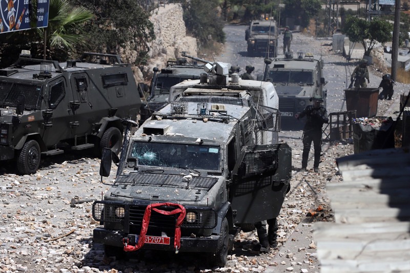 Los pales­ti­nos se enfren­tan a las fuer­zas israe­líes tras el fune­ral de Muham­mad Abu Sara, de 11 años, ase­si­na­do por un sol­da­do israe­lí, cer­ca de la ciu­dad cis­jor­da­na de Hebrón, el 29 de julio. Imá­ge­nes de Ihab Ala­mi APA