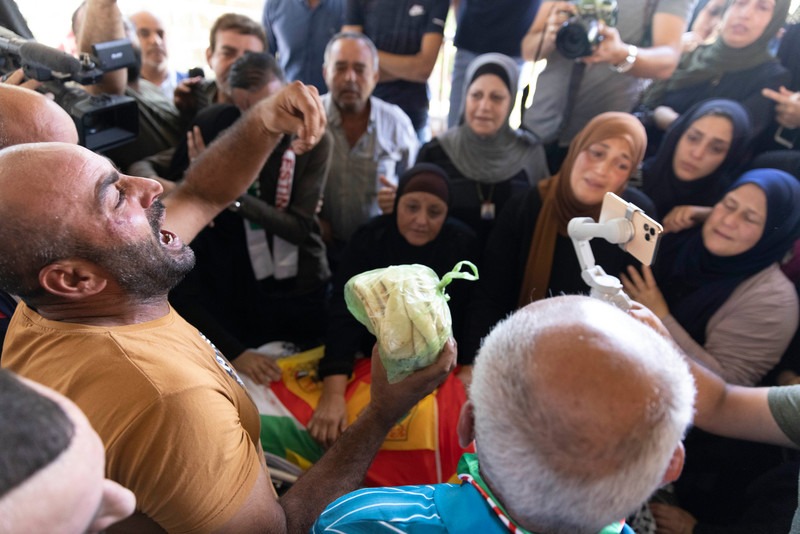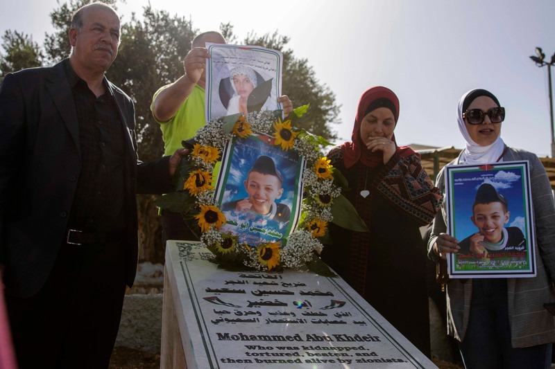 La fami­lia de Moham­med Abu Khdeir se encuen­tra ante la tum­ba del niño en el barrio de Shua­fat de Jeru­sa­lén el 3 de julio. La fami­lia de Abu Khdeir cele­bró una cere­mo­nia con­me­mo­ra­ti­va para con­me­mo­rar los sie­te años del secues­tro y bru­tal ase­si­na­to del joven de 16 años a manos de colo­nos israe­líes. Heather Sha­ro­na Weiss ActiveStills