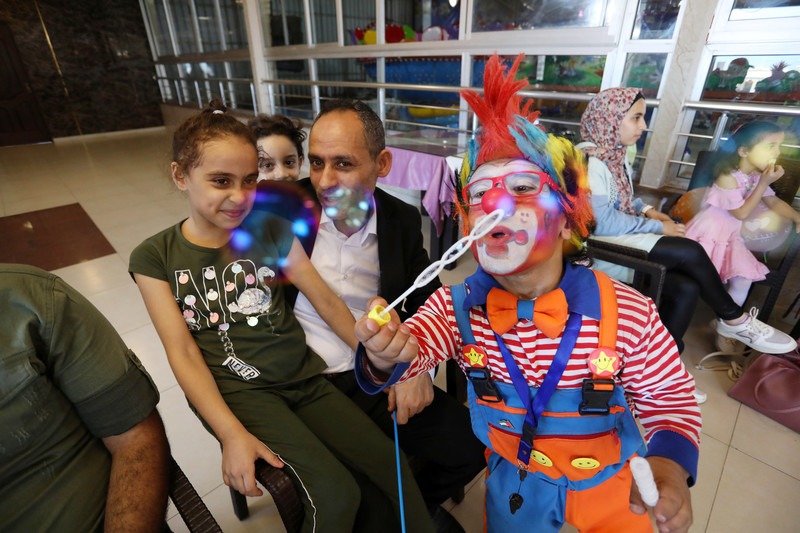Suzie Ish­kon­ta­na y su padre Riyad asis­ten a un even­to en la ciu­dad de Gaza orga­ni­za­do para niños cuyos fami­lia­res murie­ron en los recien­tes ata­ques aéreos israe­líes, el 28 de julio. Suzie y su padre fue­ron saca­dos de los escom­bros de su casa des­pués de un ata­que aéreo israe­lí que mató a la madre de la niña y a cua­tro de sus her­ma­nos. Imá­ge­nes de Ash­raf Amra APA