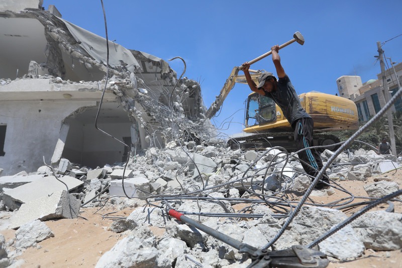 Los tra­ba­ja­do­res pales­ti­nos reti­ran los escom­bros de los edi­fi­cios recien­te­men­te des­trui­dos en los bom­bar­deos israe­líes en la ciu­dad de Gaza el 27 de julio. Human Rights Watch dijo que inves­ti­gó tres ata­ques israe­líes que mata­ron a 62 civi­les pales­ti­nos don­de no había obje­ti­vos mili­ta­res evi­den­tes en las cer­ca­nías. Otros ata­ques israe­líes duran­te el con­flic­to tam­bién fue­ron pro­ba­ble­men­te ile­ga­les, dijo el gru­po de dere­chos. Imá­ge­nes de Ash­raf Amra APA