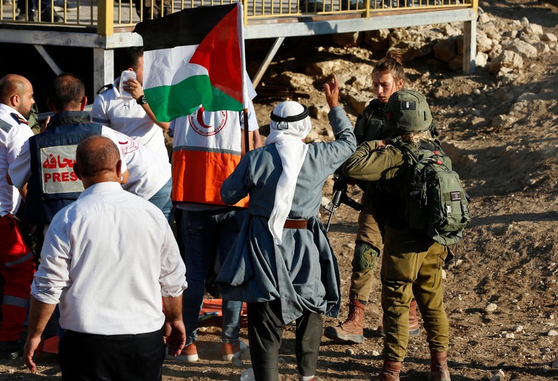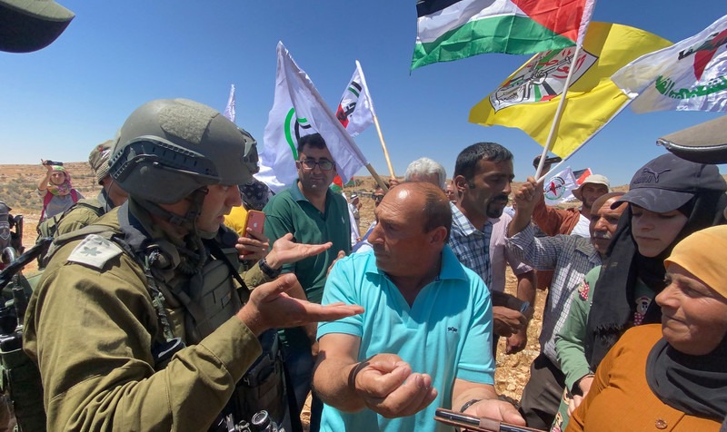 Los pales­ti­nos dis­cu­ten con los sol­da­dos israe­líes duran­te una pro­tes­ta con­tra la con­fis­ca­ción de tie­rras cer­ca de la aldea de Yat­ta, al sur de la ciu­dad cis­jor­da­na de Hebrón, el 17 de julio. Israel nie­ga los per­mi­sos de pla­ni­fi­ca­ción para que los pales­ti­nos cons­tru­yan en sus tie­rras o amplíen las casas exis­ten­tes para adap­tar­se al cre­ci­mien­to natu­ral, par­ti­cu­lar­men­te en Jeru­sa­lén y el Área C, que cons­ti­tu­ye el 60 por cien­to de la Cis­jor­da­nia ocu­pa­da. Imá­ge­nes de Ihab Ala­mi APA