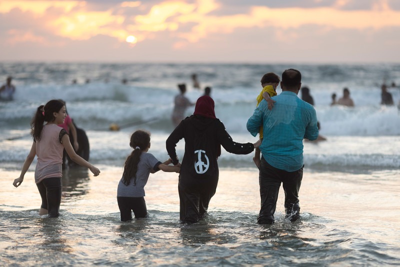 Los pales­ti­nos, algu­nos con ciu­da­da­nía israe­lí y otros de Cis­jor­da­nia, pasan tiem­po en la pla­ya de Jaf­fa duran­te el ter­cer día de Eid al-Adha, el 22 de julio. Oren Ziv ActiveStills
