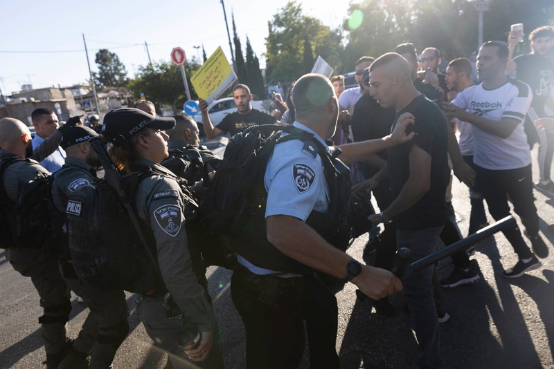 La poli­cía israe­lí dis­per­sa vio­len­ta­men­te a los pales­ti­nos que pro­tes­tan en apo­yo de los resi­den­tes de Sheikh Jarrah bajo ame­na­za de des­alo­jo en favor de los colo­nos israe­líes en el barrio de Jeru­sa­lén Orien­tal, el 17 de julio. Oren Ziv ActiveStills