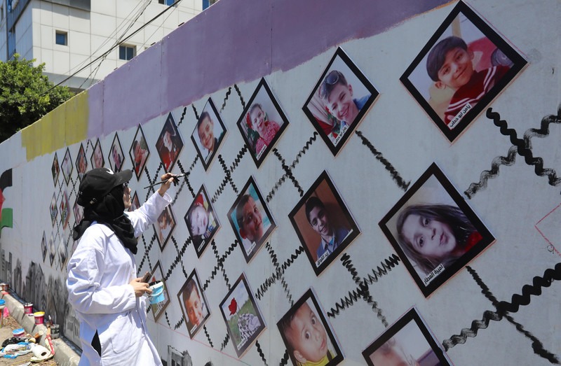 Artis­tas pales­ti­nos pin­tan mura­les y mues­tran fotos de niños que murie­ron duran­te la recien­te esca­la­da mili­tar israe­lí fren­te a las ofi­ci­nas del Pro­gra­ma de las Nacio­nes Uni­das para el Desa­rro­llo en la ciu­dad de Gaza el 13 de julio. Imá­ge­nes de Ash­raf Amra APA