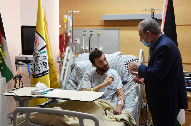 El pri­mer minis­tro de la Auto­ri­dad Pales­ti­na, Moham­med Ish­ta­yeh, visi­ta a Gha­zan­far Abu Atwan, recién libe­ra­do de la deten­ción israe­lí, en un hos­pi­tal cer­ca de la ciu­dad de Rama­llah en Cis­jor­da­nia el 9 de julio. Abu Atwan se decla­ró en huel­ga de ham­bre duran­te más de 60 días en pro­tes­ta por estar dete­ni­do sin car­gos ni jui­cio tras ser dete­ni­do en octu­bre de 2020. Ofi­ci­na del Pri­mer Ministro