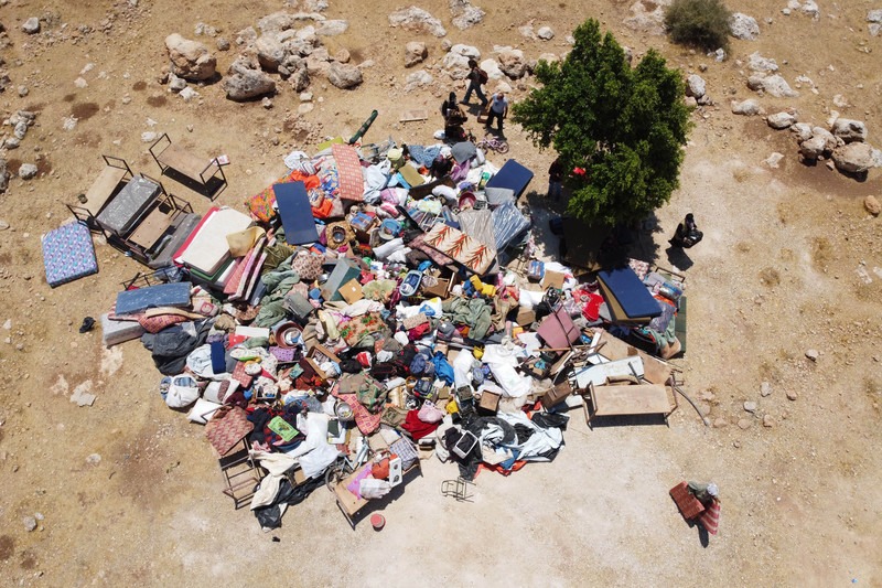 Los resi­den­tes de la comu­ni­dad de Khir­bet Hum­sa en el valle del Jor­dán en la Ribe­ra Occi­den­tal reco­gen sus per­te­nen­cias con­fis­ca­das por las fuer­zas israe­líes y arro­ja­das en Ein Shi­bli el 8 de julio. El día ante­rior, Israel demo­lió toda la aldea por sép­ti­ma vez des­de noviem­bre de 2020 en su inten­to con­ti­nuo de des­pla­zar a esta comu­ni­dad. Oren Ziv ActiveStills