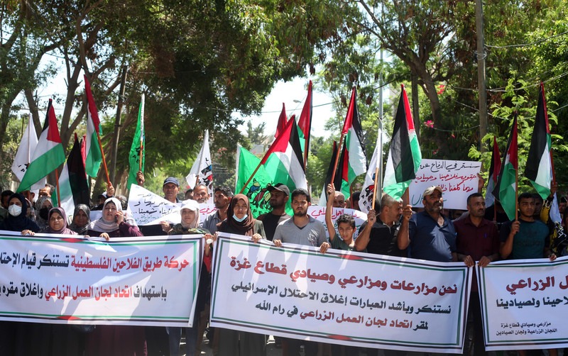 Los pales­ti­nos par­ti­ci­pan en una pro­tes­ta con­tra el cie­rre por par­te de Israel de la sede de Rama­llah de la Unión de Comi­tés de Tra­ba­jo Agrí­co­la fren­te a las ofi­ci­nas de la OCENU en la ciu­dad de Gaza el 8 de julio. La Auto­ri­dad Pales­ti­na con­de­nó los «ata­ques sis­te­má­ti­cos y gene­ra­li­za­dos» de Israel con­tra los sec­to­res de la salud y la agri­cul­tu­ra pales­ti­nos, «inclui­dos los ata­ques con­ti­nuos y deli­be­ra­dos, las reda­das en cur­so y el cie­rre de los Comi­tés de Tra­ba­ja­do­res de la Salud y los Comi­tés de Tra­ba­jo Agrí­co­la de la Unión y el hos­ti­ga­mien­to de su per­so­nal». Imá­ge­nes de Yous­sef Abu Wat­fa APA