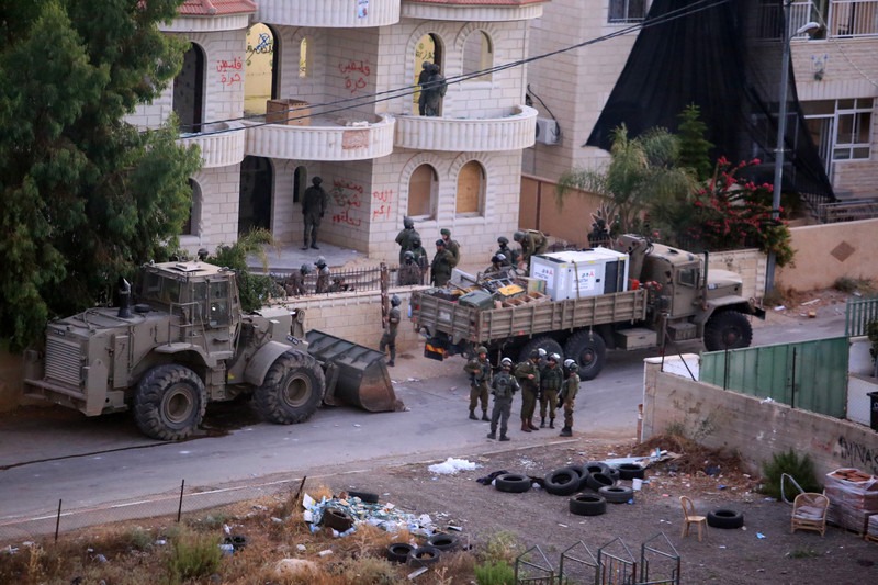 Sol­da­dos israe­líes se encuen­tran fren­te a la casa de la espo­sa de Mun­ta­sir al-Sha­la­bi y sus hijos en Tur­mus Aya, cer­ca de la ciu­dad cis­jor­da­na de Rama­llah, el 8 de julio. El ejér­ci­to israe­lí demo­lió la casa en ven­gan­za puni­ti­va por la pre­sun­ta par­ti­ci­pa­ción de al-Sha­la­bi, que se encuen­tra dete­ni­do en Israel, en un ata­que a tiros en Cis­jor­da­nia que mató a un estu­dian­te israe­lí. Imá­ge­nes de Ibrahim Attaia APA